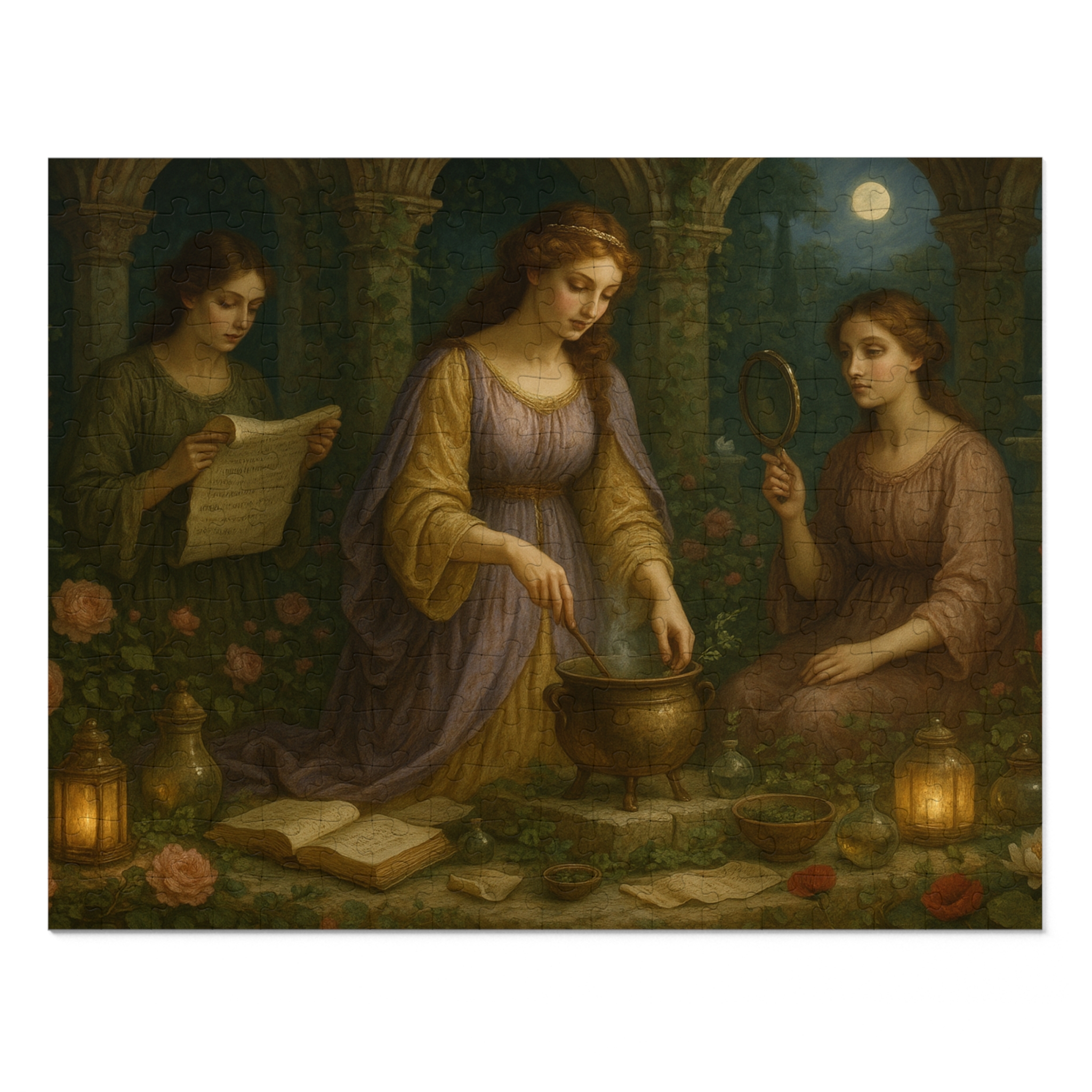 Step into a moonlit Renaissance garden where three priestesses gather among roses, scrolls, and silken fabrics to brew a love potion beneath flickering lanterns.